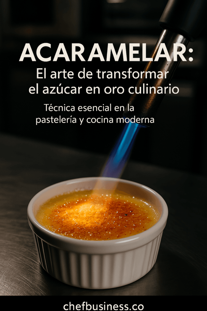 - Acaramelado directo: Se espolvorea azúcar sobre la preparación y se somete a calor intenso (generalmente con soplete o bajo salamandra) hasta que el azúcar se funde y carameliza. Esta técnica se utiliza en postres como la crema catalana o crème brûlée.